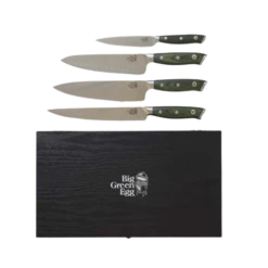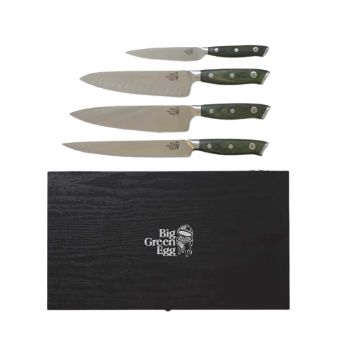 Deze set bestaat uit vier hoogwaardige messen die elke keukenklus moeiteloos klaren. De set is vervaardigd van premium Duits roestvast staal met een hardheid van 54-58 HRC. De messen bestaan zijn uit één stuk gesmeed, waarbij de krop van de messen zorgt voor een goede balans. Elk mes is voorzien van een Big Green Egg-logo op een groen houten handvat. De set is verpakt in een giftbox waarin je de messen kunt bewaren.
