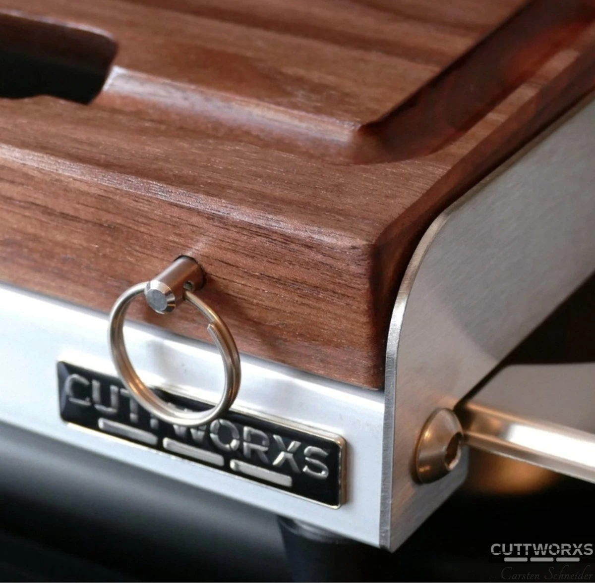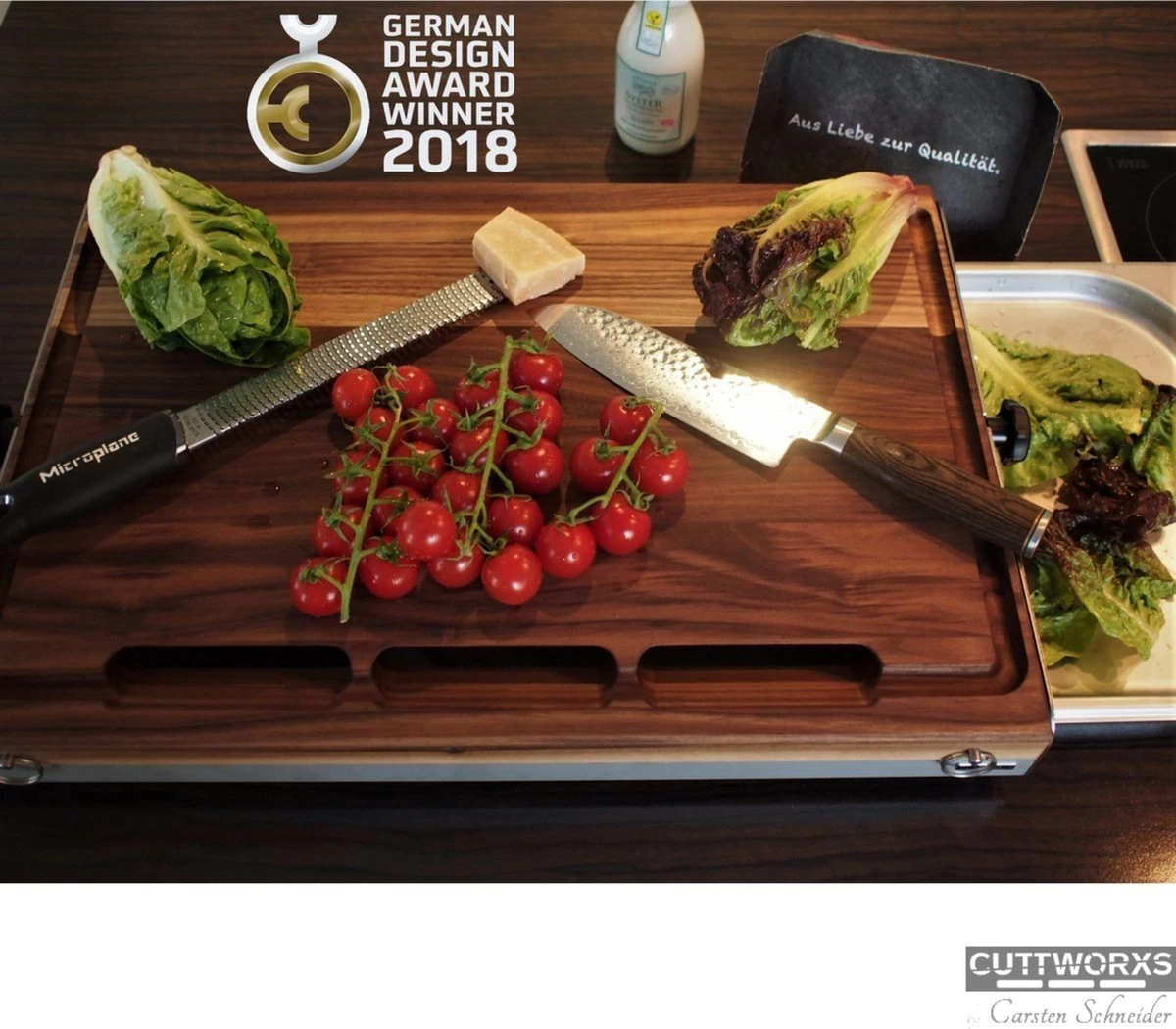 Voor de veeleisende gebruiker, Deze snijplank beter gezegd werkplek in de keuk is gemakkelijk te hanteren. De snijplank in combinatie met de optionele kunststof bovenblad en consol werd bekroond met de German Design Award in de categorie Excellent Product Design Kitchen. De jury prees de uitstekende materialen, het schone vakmanschap en de goed doordachte details.