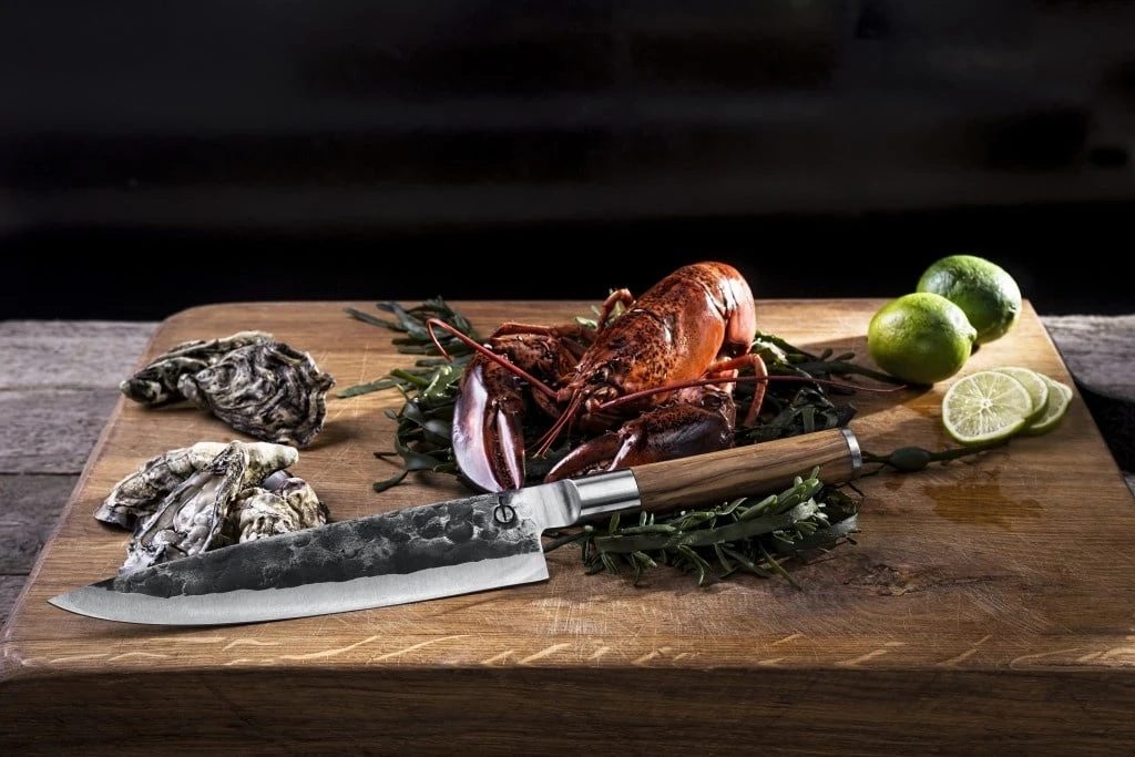 De Olive Forged messen hebben een prachtige olijfhouten handgreep, de handgreep is extra opvallend door de doorlopende krop en de toegevoegde pommel op de achterzijde. De pommel is afgewerkt in dezelfde stijl als het lemmet, waardoor alles één mooi geheel wordt. Het mes is vlijmscherp en ligt het voortreffelijk in de hand. Het lemmet heeft een gehamerde structuur. waardoor het uniek in zijn soort is