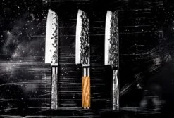 De Olive Forged messen hebben een prachtige olijfhouten handgreep, de handgreep is extra opvallend door de doorlopende krop en de toegevoegde pommel op de achterzijde. De pommel is afgewerkt in dezelfde stijl als het lemmet, waardoor alles één mooi geheel wordt. Het mes is vlijmscherp en ligt het voortreffelijk in de hand. Het lemmet heeft een gehamerde structuur. waardoor het uniek in zijn soort is