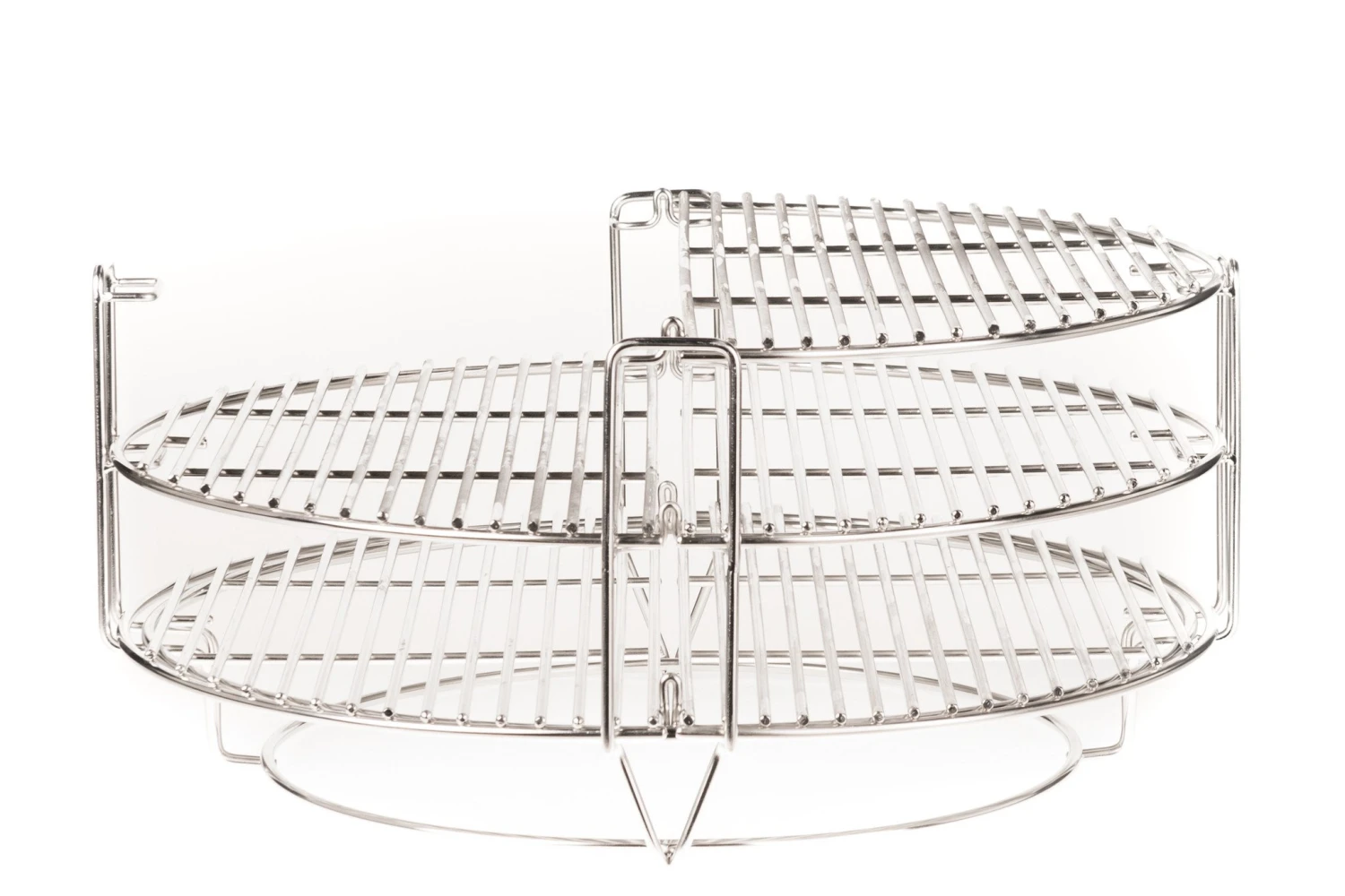Binnen in de Kamado Joe Classic III is de revolutionaire slo roller, hyperbolic insert geplaatst. Dat is een gietaluminium constructie dat een optimale circulatie creëert door lucht samen te brengen en voort te stuwen. Een sublieme nieuwe tool die je kan gebruiken om mee te roken. De Kamado Joe Classic III bestaat uit 3 levels/ verdiepingen. Daardoor is hij iets hoger dan zijn voorganger. De gepatenteerde aslade is ook weer aanwezig maar er wordt voortaan een extra dik RVS kolenmand met divider standaard meegeleverd. Hierdoor wordt het schoonmaken van jouw Kamado Joe nog gemakkelijker.