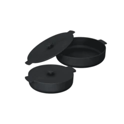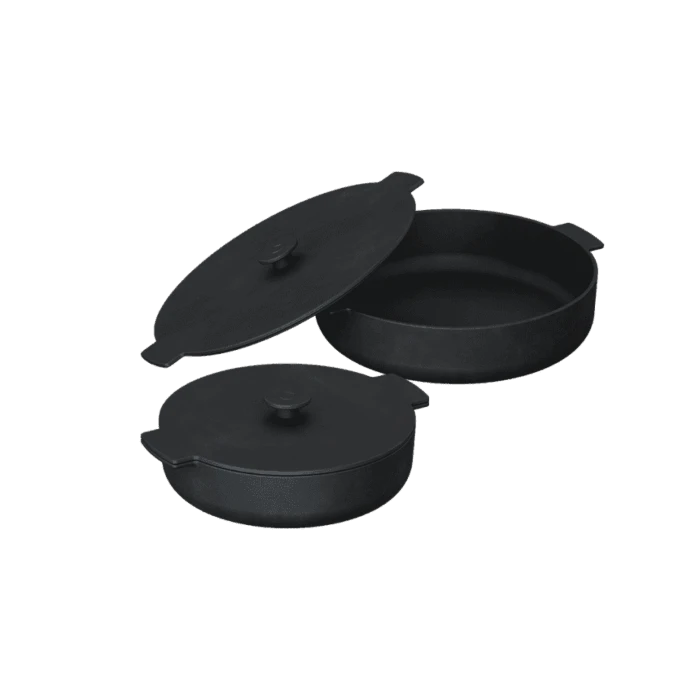 De OFYR Cast Iron Casserole set bestaat uit twee strak vormgegeven gietijzeren pannen met diameters van 21 cm en 26 cm. De pannen zijn geschikt om op de OFYR kookplaat gebruikt te worden maak kunnen ook in de oven of op de BBQ/ kamado. De pannen zijn voorzien van goede warmteverdeling waardoor ze geschikt zijn voor de bereiding van allerlei gerechten.